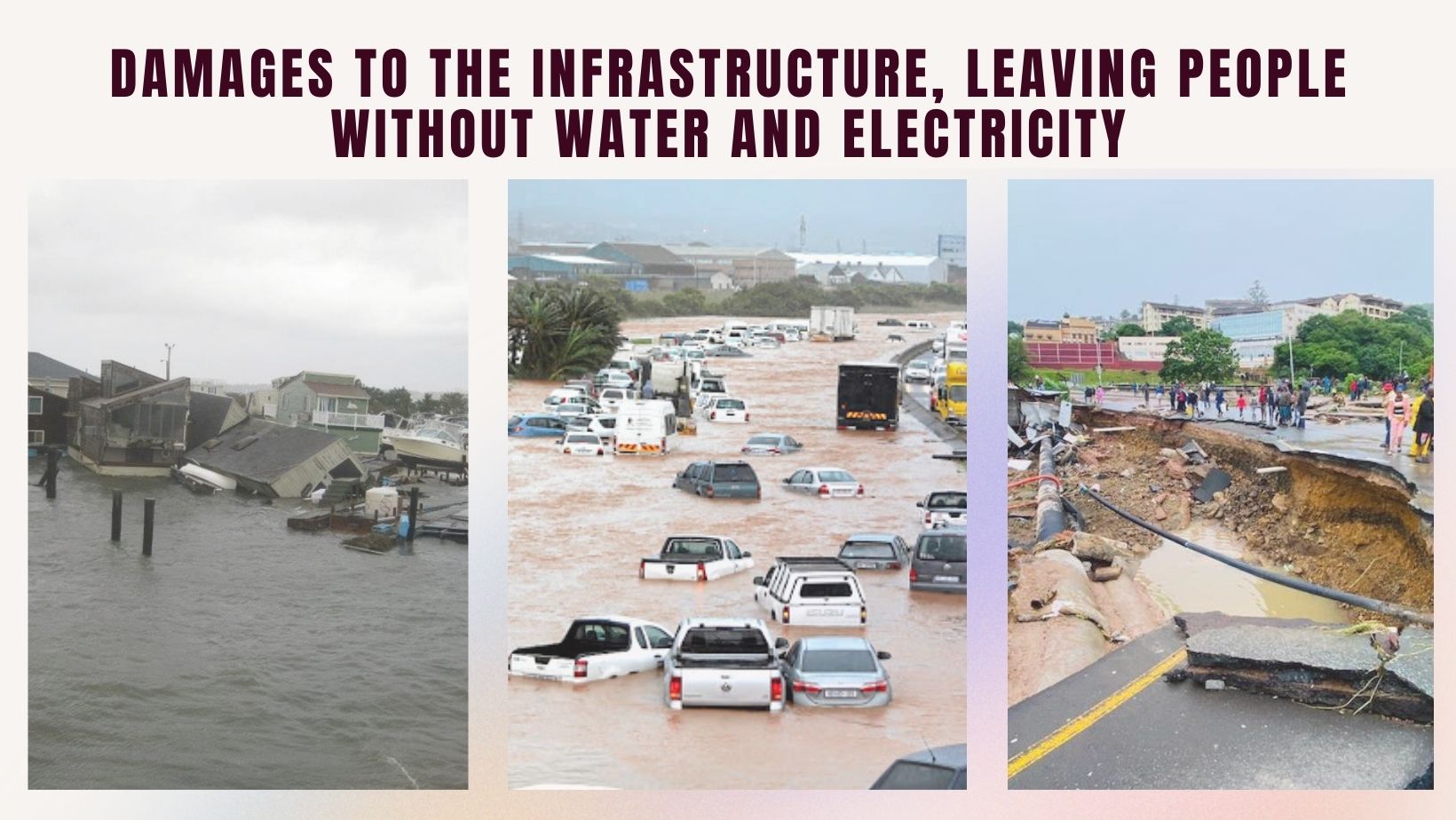 Critical infrastructure, including roads, transportation, communications, electrical, and water supply was affected. Technical teams are working round the clock to restore services. Some Power Stations in eThekwini was not accessible due to the floods.