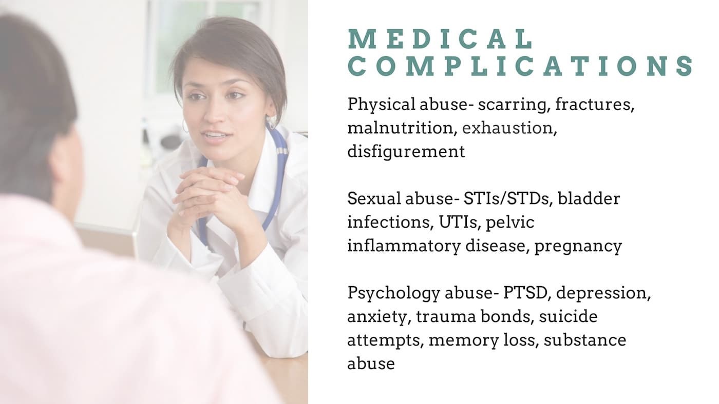 Victims may develop STDs and HIV/AIDS. Perpetrators frequently use substance abuse as a means to control their victims, which leads to compromised health, self-destructive behaviour, and long-term physical harm. Victims suffer injuries due to torture, where their bodies are broken and beaten into submission