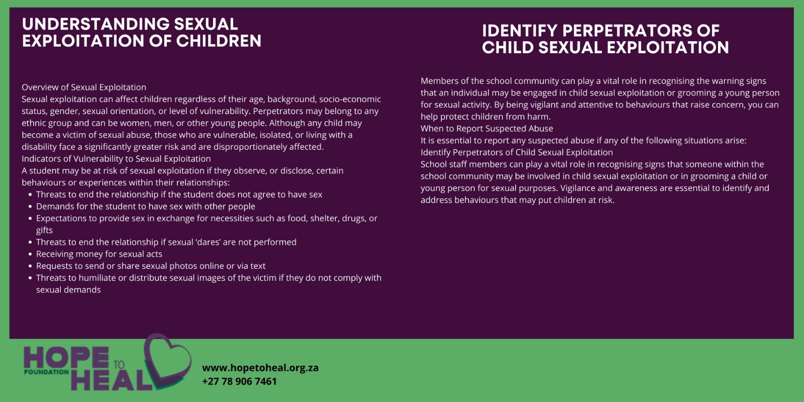 You can play a critical role in identifying signs that a member of the school community maybe engaging in child sexual exploitation or grooming a child or young person for the purpose of engaging in sexual activity.