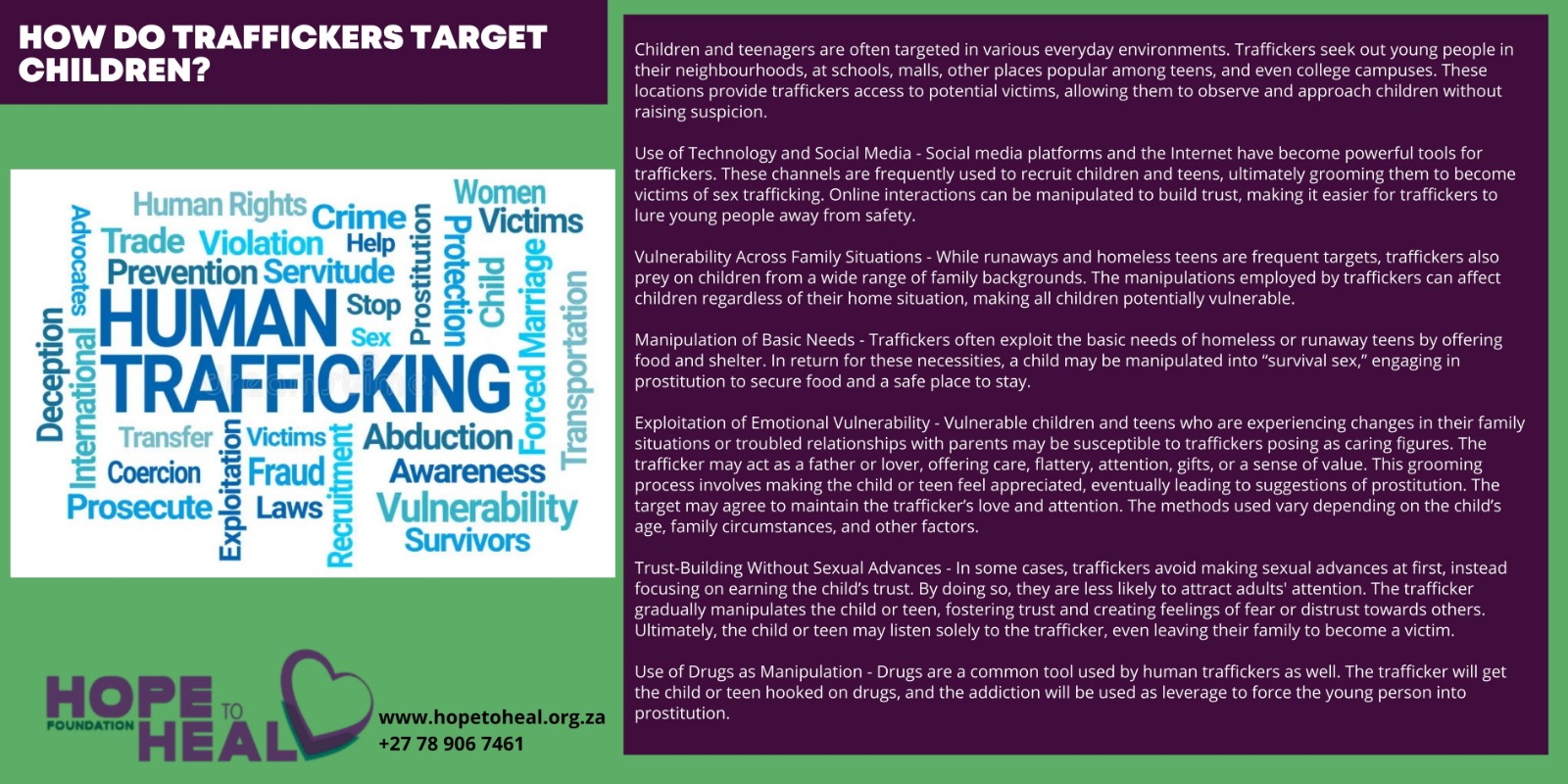 While runaways and homeless teens are frequent targets, children in all types of family situations are vulnerable to the manipulations of traffickers.