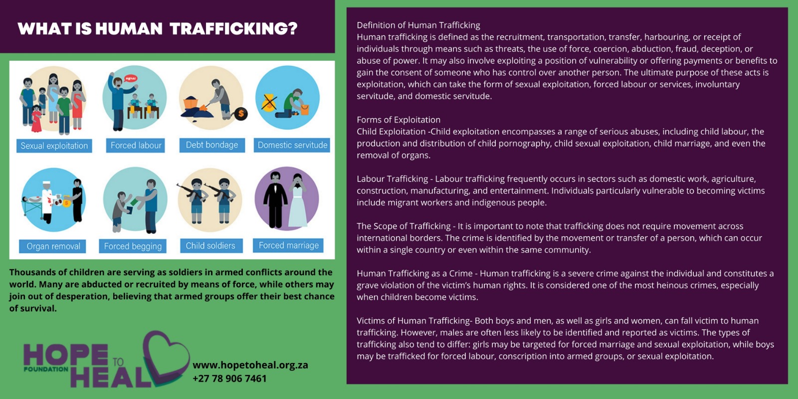 Human trafficking – It is the “recruitment, transportation, transfer, harbouring or receipt of a person, by means of the threat of use of force or other forms of coercion, of abduction, of fraud, of deception, of the abuse of power or of a position of vulnerability or of the giving or receiving of payments or benefits to achieve the consent of a person having control over another person, for the purpose of exploitation.” Exploitation includes sexual exploitation, forced labour or services, involuntary & domestic servitude, Child exploitation -child labour, child porn, child sexual exploitation, child marriage, or the removal of organs.