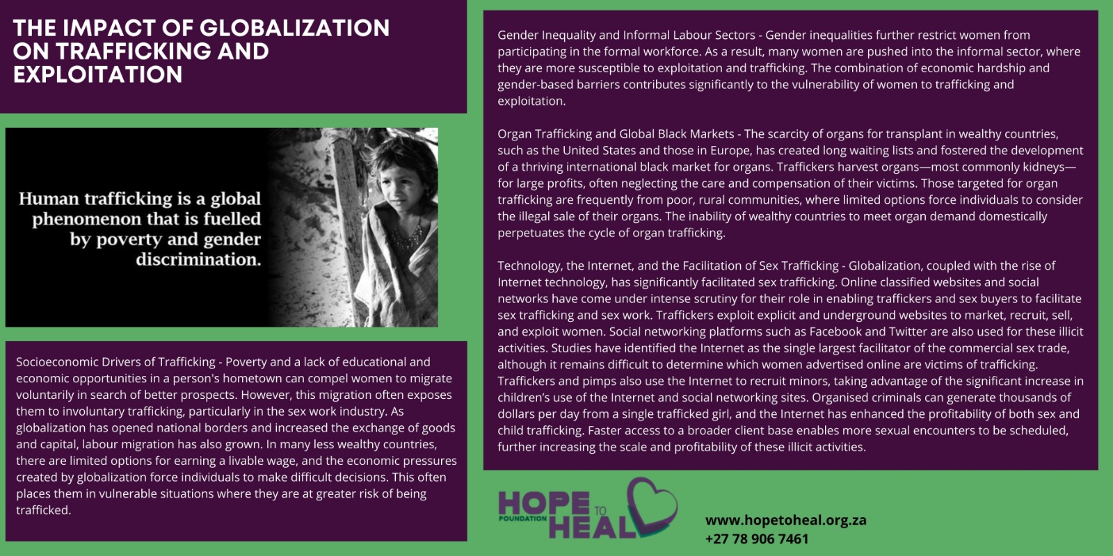 Poverty and lack of educational and economic opportunities in one’s hometown may lead women to voluntarily migrate and then be involuntarily trafficked into sex work. As globalization opened national borders to greater exchange of goods and capital, labour migration also increased. Less wealthy countries have fewer options for liveable wages. The economic impact of globalization pushes people to make conscious decisions to migrate and be vulnerable to trafficking. Gender inequalities that hinder women from participating in the formal sector also push women into informal sectors. Long waiting lists for organs in the United States and Europe created a thriving international black market. Traffickers harvest organs, particularly kidneys, to sell for large profit and often without properly caring for or compensating the victims. Victims often come from poor, rural communities and see few other options than to sell organs illegally. Wealthy countries’ inability to meet organ demand within their own borders perpetuates trafficking. Globalization and the rise of Internet technology has also facilitated sex trafficking. Online classified sites and social networks have been under intense scrutiny for being used by johns and traffickers in facilitating sex trafficking and sex work in general. Traffickers use explicit sites and underground sites to market, recruit, sell, and exploit women. (Facebook, Twitter, and other social networking sites) Studies have identified the Internet as the single biggest facilitator of commercial sex trade, although it is difficult to ascertain which women advertised are sex trafficking victims. Traffickers and pimps use the Internet to recruit minors, since Internet and social networking sites usage have significantly increased especially among children. Organized criminals can generate up to several thousand dollars per day from one trafficked girl, and the Internet has further increased profitability of sex trafficking and child trafficking. With faster access to a wider clientele, more sexual encounters can be scheduled.