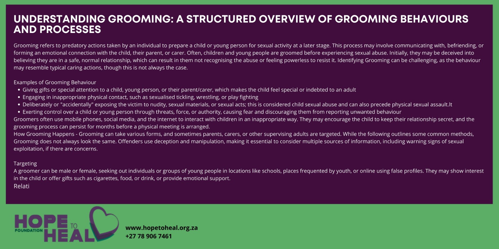 Grooming is when a person engages in predatory conduct to prepare a child or young person for sexual activity at a later time. Grooming can include communicating and/or attempting to befriend or establish a relationship or other emotional connection with the child or their parent/carer. Young people are often ‘groomed’ before they are sexually abused. At first they may be tricked into thinking they are in a safe and normal relationship so they may not know it’s happening or may feel they have no choice but to be abused. It may be hard to identify when someone is being groomed until after they have been sexually abused, because grooming behaviour can sometimes look like ‘normal’ caring behaviour, however this is not always the case.