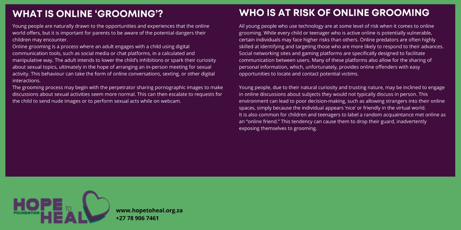 Online grooming occurs when an adult uses electronic communication (including social media) in a predatory fashion to try to lower a child’s inhibitions, or heighten their curiosity about sex, with the aim of eventually meeting them in person for the purposes of sexual activity. This can include online chats, sexting, and other interactions.