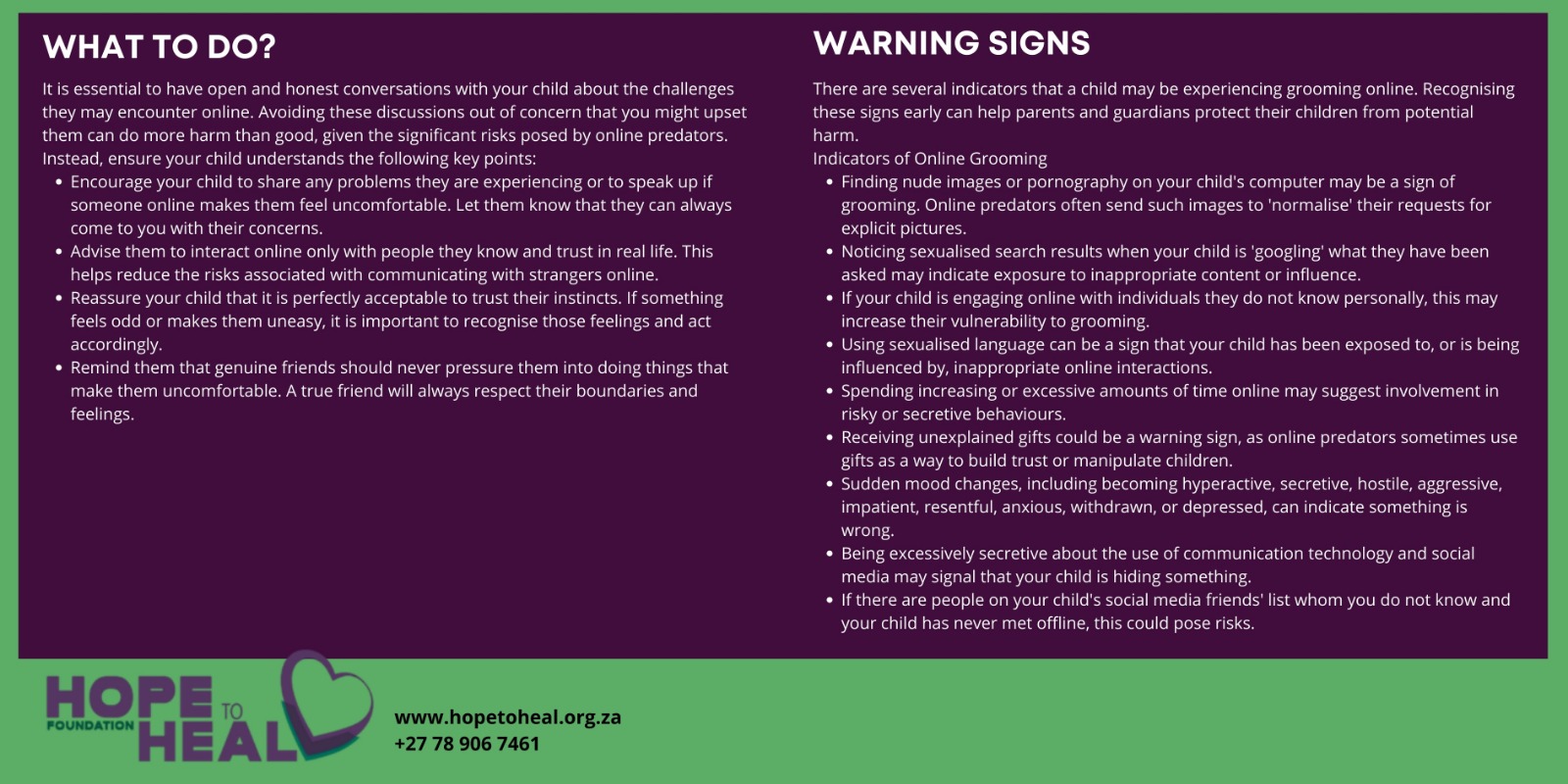 Groomers may rely on mobile phones, social media and the internet to interact with children in inappropriate ways and will often ask the child to keep their relationship a secret. The grooming process may continue for months before the offender arranges a physical meeting.
