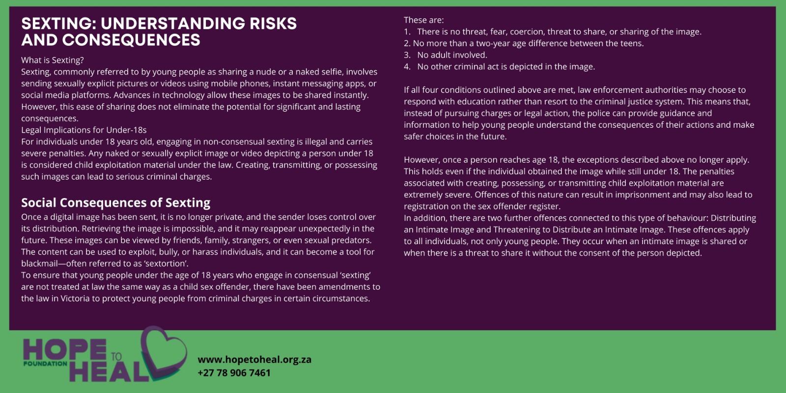 To ensure that young people under the age of 18 years who engage in consensual ‘sexting’ are not treated at law the same way as a child sex offender, there have been amendments to the law in Victoria to protect young people from criminal charges in certain circumstances. These are: