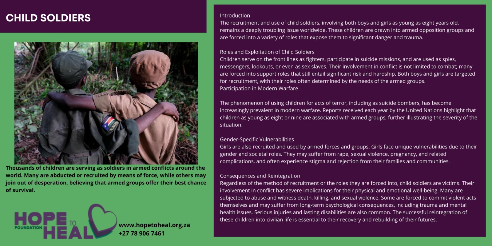 Many are abducted or recruited by means of force, while others may join out of desperation believing that armed groups offer their best chance of survival.