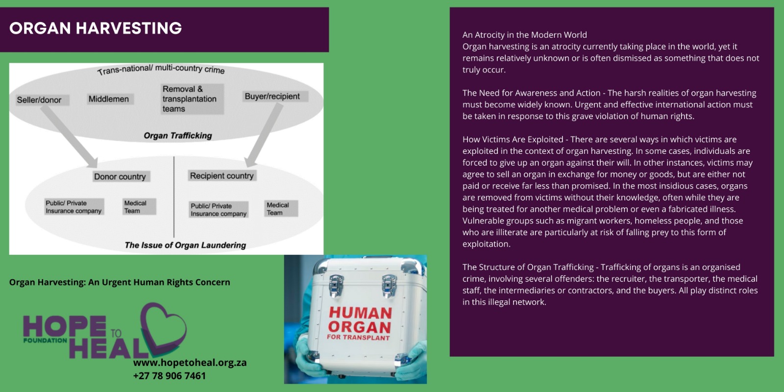 In some cases, the victim is compelled into giving up an organ. In other cases, the victim agrees to sell an organ in exchange of money/goods but is not paid (or paid less). Finally, the victim may have the organ removed without the victim’s knowledge (usually when the victim is treated for another medical problem/illness – real or orchestrated problem/illness). Migrant workers, homeless persons, and illiterate persons are particularly vulnerable to this form of exploitation. Trafficking of organs is an organized crime, involving several offenders: the recruiter, the transporter, the medical staff, the middlemen/contractors & the buyers.