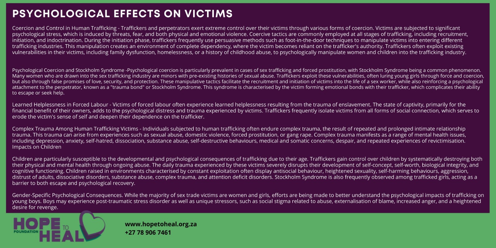 Human trafficking victims may experience complex trauma as a result of repeated cases of intimate relationship trauma over long periods of time including, but not limited to, sexual abuse, domestic violence, forced prostitution, or gang rape. Complex trauma involves multifaceted conditions of depression, anxiety, self-hatred, dissociation, substance abuse, self-destructive behaviours, medical and somatic concerns, despair, and revictimization.