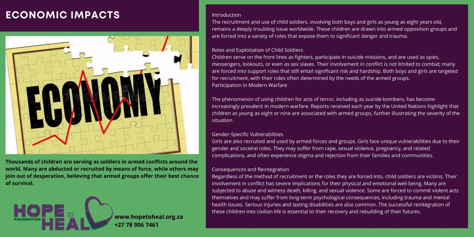 Regardless of how children are recruited and of their roles, child soldiers are victims, whose participation in conflict bears serious implications for their physical and emotional well-being. They are commonly subject to abuse and most of them witness death, killing, and sexual violence. Many are forced to commit violent acts, and some suffer serious long-term psychological consequences. Some suffer serious injuries and end up living with disabilities for the rest of their lives. The reintegration of these children into civilian life is an essential part of the work to help child soldiers rebuild their lives.